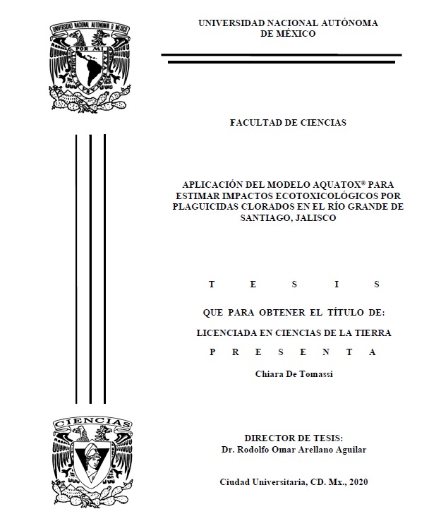 Chiara De TomassiPublicación académica/científicaPublicación escritaBase de datosEl presente trabajo nos habla sobre el entendimiento de los impactos de contaminantes, mediante el desarrollo de modelos computacionales. 2020_T.L._C.TOMASSI.pdfAPLICACIÓN DEL MODELO AQUATOX® PARA ESTIMAR IMPACTOS ECOTOXICOLÓGICOS POR PLAGUICIDAS CLORADOS EN EL RÍO GRANDE DE SANTIAGO, JALUniversidad Nacional Autónoma de México2020Occidente de MéxicoJaliscoGran industriaIndustria químicaUrbeAguas negrasBasura urbana / residuos sólidosSmog urbanoAgua superficialSedimentosArgumentosMunicipioModelaciónImpactoPlaguicidas Organoclorados