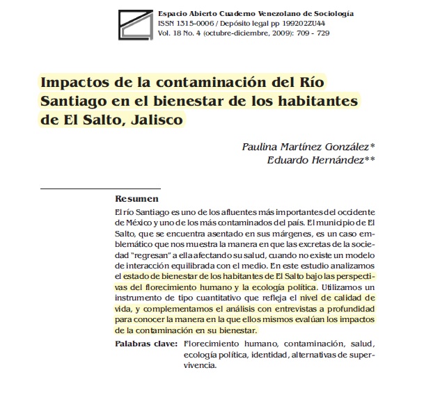 Paulina Martínez GonzálezEduardo Hernández NoticiaPublicación escritaPublicación académica/científicaBase de datosEn el presente artículo se analiza el bienestar de los habitantes de El Salto, bajo las perspectivas del florecimiento humano y la ecología política. 2009 P.MARTINEZ.G Y E.H."Impactos de la contaminación del Río Santiago en el bienestar de los habitantes de El Salto, Jalisco"Universidad del Zulia2009Occidente de MéxicoJaliscoDerrameGran industriaIndustria químicaAgua superficialSedimentosSueloSuelo agrícolaArgumentosMunicipioFlorecimiento humanocontaminaciónsaludecología políticaidentidadalternativas de supervivencia