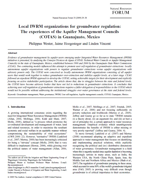 Philippus Wester, Jaime Hoogesteger, Linden VincentPublicación académica/científicaPublicación escritaBase de datosEl presente documento trata sobre la gestión de aguas subterráneas por parte de los Consejos Técnicos de Aguas (COTAS) en el estado de Guanajuato. wester_2009.pdfNatural Resources Forum2009Occidente de MéxicoGuanajuatoAgua superficialSedimentosArgumentosMunicipiosGestión de aguas subterráneasIWRMGobernanza del aguaAutorregulación de usuariosConsejos administradores de acuíferosCOTASGuanajuato