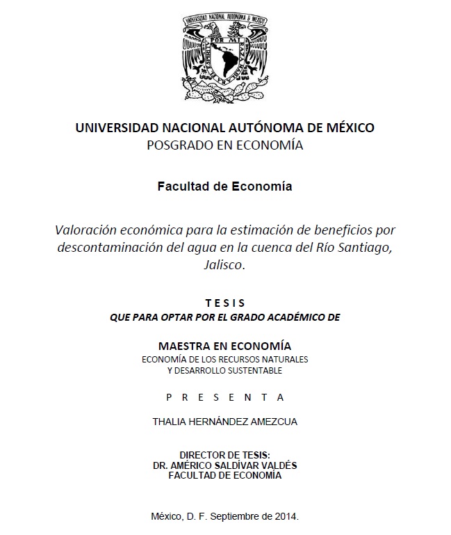 Thalía Hernández AmezcuaPublicación académica/científicaPublicación escritaBase de datosEl presente trabajo aborda el problema de contaminación del agua en la cuenca del río Santiago. 2014_T.M._T.HERNÁNDEZ.pdfValoración económica para la estimación de beneficios por descontaminación del agua en la cuenca del Río Santiago, Jalisco.Universidad Nacional Autónoma de México2014Occidente de MéxicoJaliscoGran industriaIndustria químicaUrbeAguas negrasBasura urbana / residuos sólidosSmog urbanoAgua superficialSedimentosArgumentosMunicipiosContaminación del aguaeconomía de los recursos naturalesdesarrollo sustentableRío Santiago