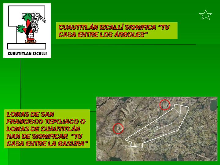 Hay dos tiraderos de basura: uno clausurado y otro en funciones de tiradero regional. El conjunto urbano se edificó en un lomerío que, por sus condiciones geológicas, era un terreno no habitable. Sin embargo, se autorizó la construcción del conjunto urbano bajo diversas condiciones que no se cumplieron, como la sustentación del suelo, sustituyendo arcillas por tepetate, lo que no se hizo nunca, mientras se simuló la construcción de muros de contención.