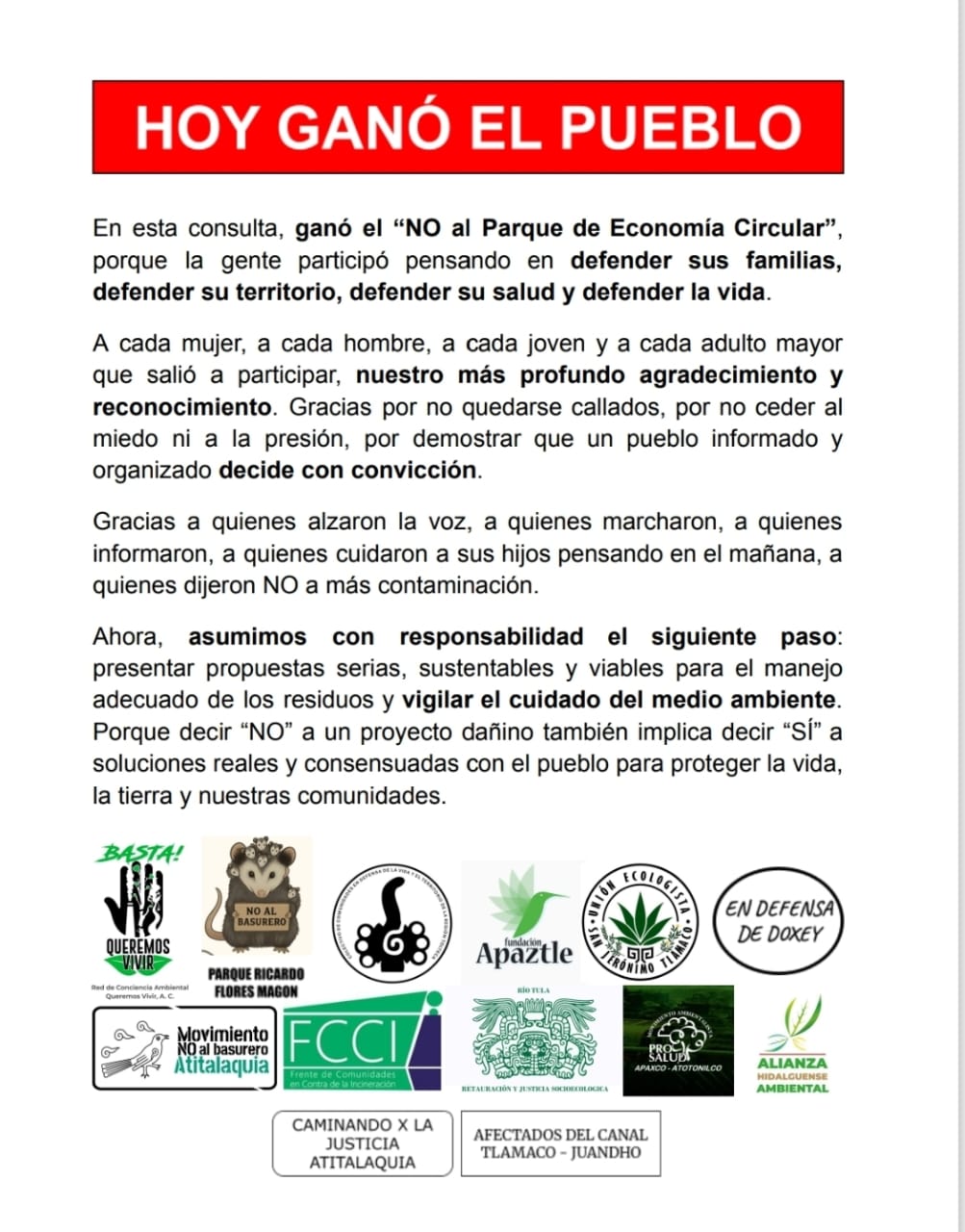 Por nuestra parte, hemos participado en el Foro con Alianza Global para Alternativas a la Incineración (GAIA) en América Latina en 2016 y 2018, con especial énfasis en el 3er Encuentro Internacional contra la Incineración de Residuos en noviembre, que reunió a organizaciones de Europa (Italia y España) y de América Latina (Ecuador, Argentina, El Salvador y Chile). También hemos puesto en marcha un proyecto de "basura cero", que promueve la separación de residuos en diversas colonias de Apaxco, incluyendo escuelas primarias, secundarias y de nivel medio superior.